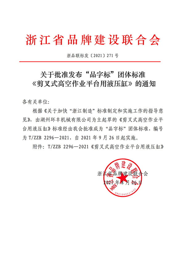 Zawiadomienie o zatwierdzeniu publikacji grupy „Pinyibiao” standardu „Cylinder hydrauliczny dla platform roboczych na nożyce